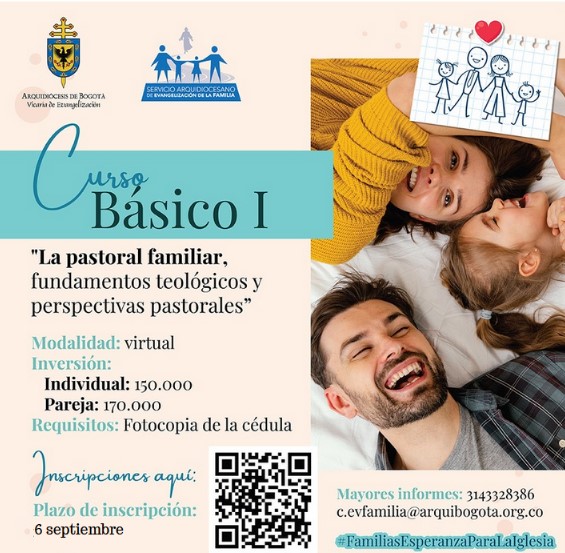 El Servicio Arquidiocesano de Evangelización de la Familia en convenio con la Fundación Universitaria Monserrate invitan a los laicos, familias, sacerdotes y religiosos interesados en formarse como animadores de evangelización de la familia a participar en el Curso básico I "La pastoral familiar, fundamentos teológicos y perspectivas pastorales" el primero de dos cursos que hacen parte del diplomado: Fundamentos teológicos y antropológicos de la pastoral familiar