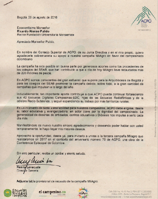 Centro de información Yo quiero Noticias Boletines Eventos Artículos Canonización Mensajes del Señor Cardenal Cartas pastorales Homilías Mensajes La voz del pastor Documentos del Vaticano NoticiasACPO agradece apoyo fundamental de Fundación Unimonserrate en campaña MilAgro2 de Septiembre de 2016Agradecimiento de ACPO por campaña MilAgro Like 0 Dislike 0 Noticias relacionadas La Santa Misa en Semana Santa La Arquidiócesis de Bogotá celebra el nombramiento de Monseñor Paolo Rudelli en la Santa Sede Prográmate
