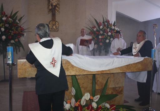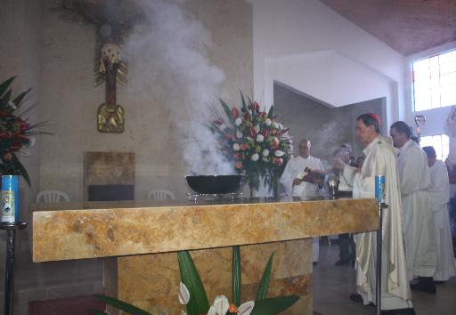Luego el Obispo lo unge con el santo crisma (aceite) las cinco cruces grabadas en la piedra, que representan las cinco llagas de Nuestro Señor Jesucristo” e inciensa en repetidas ocasiones quedando este altar bendito allí se introducen las reliquias.