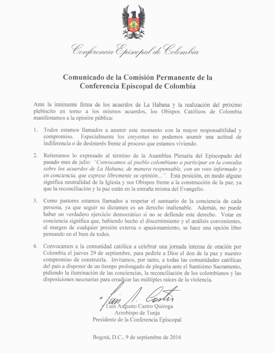 Centro de información Yo quiero Noticias Boletines Eventos Artículos Canonización Mensajes del Señor Cardenal Cartas pastorales Homilías Mensajes La voz del pastor Documentos del Vaticano NoticiasComunicado de la Comisión Permanente de la Conferencia Episcopal de Colombia9 de Septiembre de 2016Ante la inminente firma de los acuerdos de La Habana y la realización del próximo plebiscito en torno a los mismos acuerdos, los Obispos Católicos de Colombia…Imagen: www.comisiondeconciliacion.co Like 0 Dislike 0 Noticias relacionadas La Santa Misa en Semana Santa La Arquidiócesis de Bogotá celebra el nombramiento de Monseñor Paolo Rudelli en la Santa Sede Prográmate