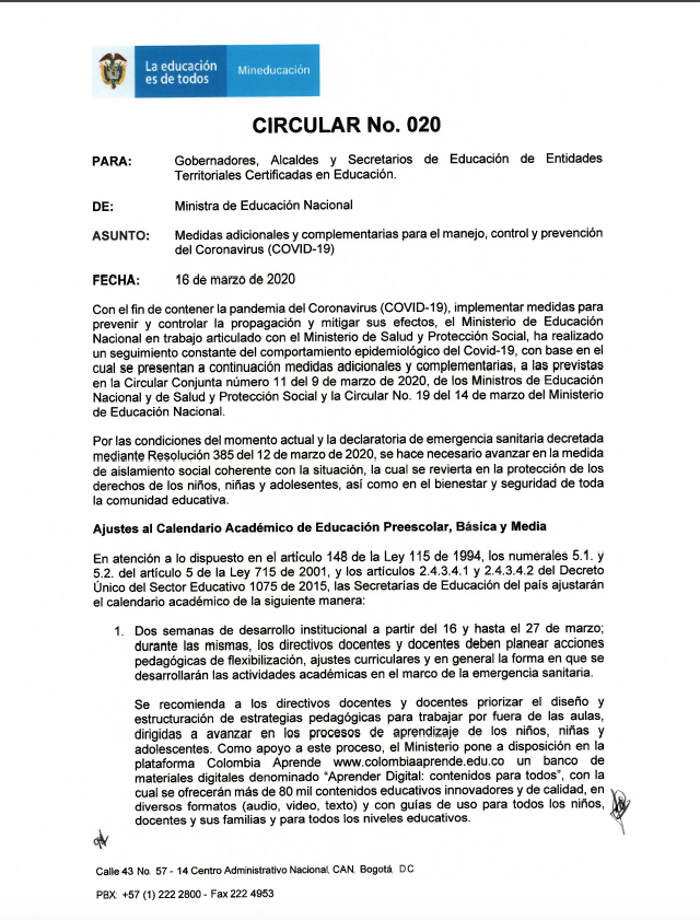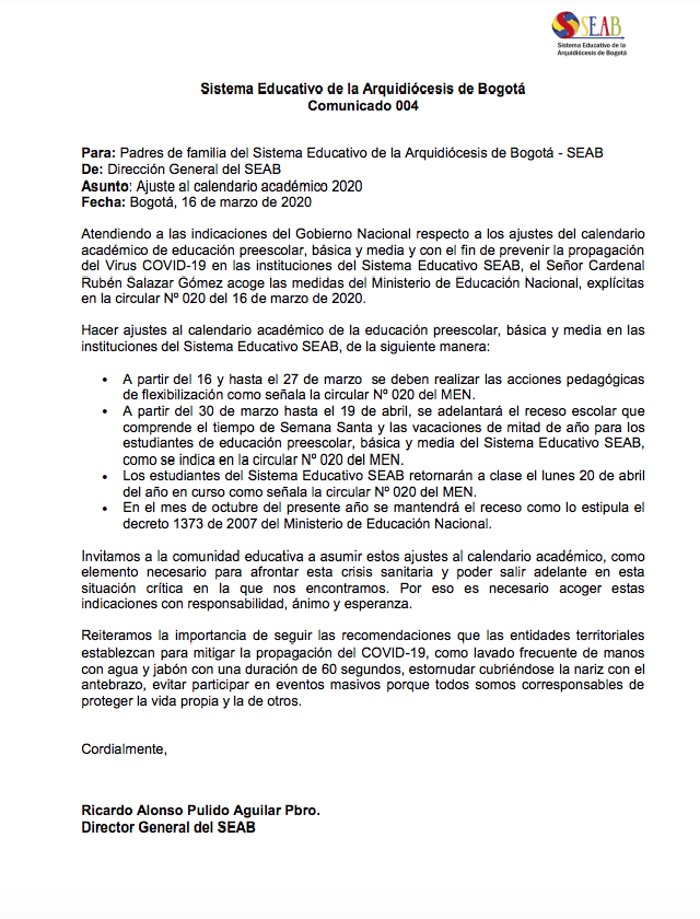 Centro de información Yo quiero Noticias Boletines Eventos Artículos Canonización Mensajes del Señor Cardenal Cartas pastorales Homilías Mensajes La voz del pastor Documentos del Vaticano NoticiasComunicado de la Dirección del SEAB sobre los ajustes al calendario académico17 de Marzo de 2020El SEAB informa a los padres de familia, y a la comunidad académica, las disposiciones del Ministerio de Educación Nacional sobre los cambios en el calendario académico Like 0 Dislike 0 Noticias relacionadas Archivo del Plan de Predicación - 2024-2025 Tiempo para nutrir, cuidar y testimoniar la fe La Arquidiócesis de Bogotá celebró la ordenación de nuevos sacerdotes y diáconos