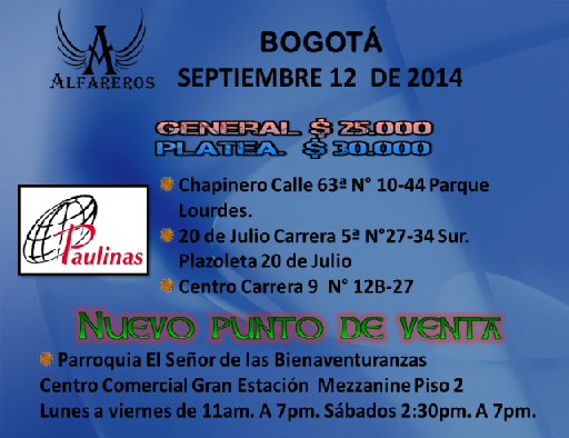 Centro de información Yo quiero Noticias Boletines Eventos Artículos Canonización Mensajes del Señor Cardenal Cartas pastorales Homilías Mensajes La voz del pastor Documentos del Vaticano NoticiasDe Bendición en Bendición, encuentro de oración y alabanza11 de Septiembre de 2014La arquidiócesis de Bogotá. en el marco de las actividades complementarias para el Gran Giro en el plan E, tiene el agrado de invitarlos al concierto con el grupo… Mayor información: en http://www.alfareros.do/index.php?page=agenda Like 0 Dislike 0 Noticias relacionadas Archivo del Plan de Predicación - 2024-2025 Tiempo para nutrir, cuidar y testimoniar la fe La Arquidiócesis de Bogotá celebró la ordenación de nuevos sacerdotes y diáconos