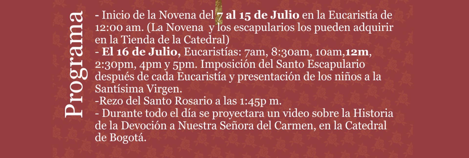 Centro de información Yo quiero Noticias Boletines Eventos Artículos Canonización Mensajes del Señor Cardenal Cartas pastorales Homilías Mensajes La voz del pastor Documentos del Vaticano NoticiasFiesta de la Virgen del Carmen16 de Julio de 2014En Colombia los transportadores la adoptaron como su patrona por la protección e intercesión que se le atribuye a la Virgen del Carmen en situaciones de peligro. Es…Haz click aquí para mayor información Like 0 Dislike 0 Noticias relacionadas Archivo del Plan de Predicación - 2024-2025 Tiempo para nutrir, cuidar y testimoniar la fe La Arquidiócesis de Bogotá celebró la ordenación de nuevos sacerdotes y diáconos
