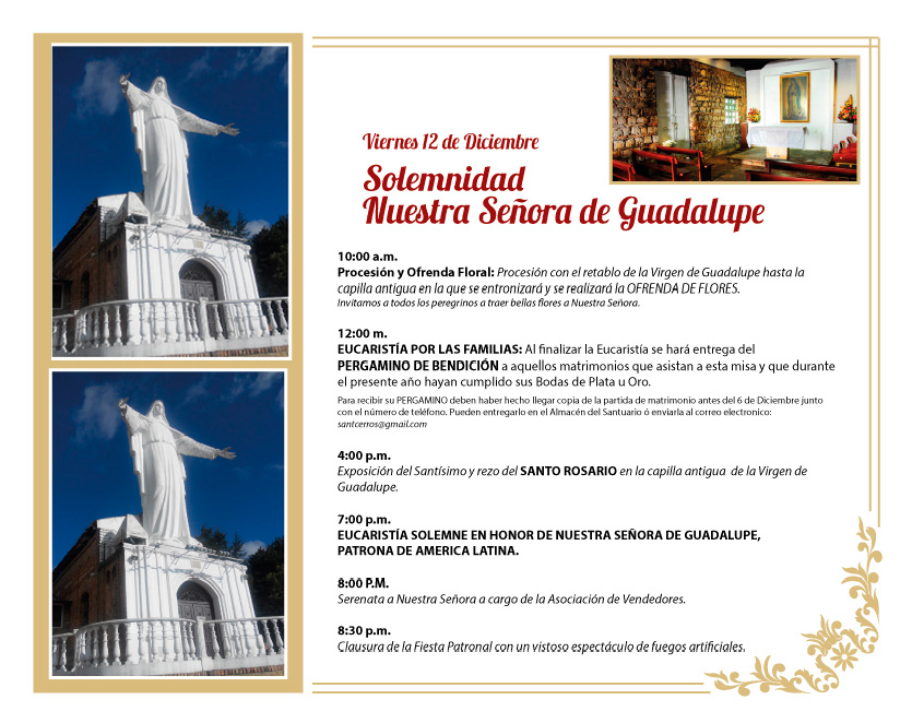 Centro de información Yo quiero Noticias Boletines Eventos Artículos Canonización Mensajes del Señor Cardenal Cartas pastorales Homilías Mensajes La voz del pastor Documentos del Vaticano NoticiasFiesta Patronal de Nuestra Señora de Guadalupe12 de Diciembre de 2014 Like 0 Dislike 0 Noticias relacionadas Archivo del Plan de Predicación - 2024-2025 Tiempo para nutrir, cuidar y testimoniar la fe La Arquidiócesis de Bogotá celebró la ordenación de nuevos sacerdotes y diáconos