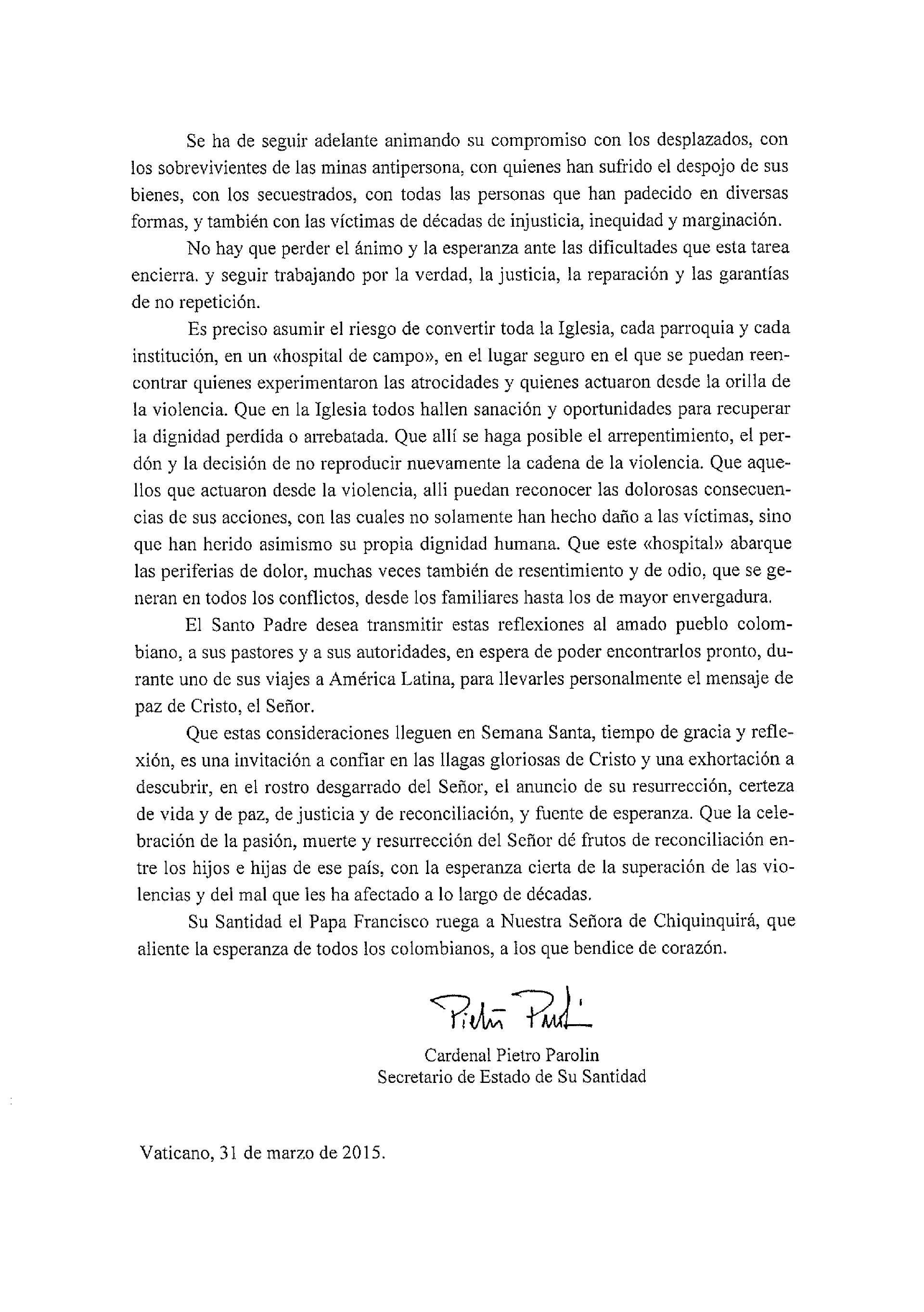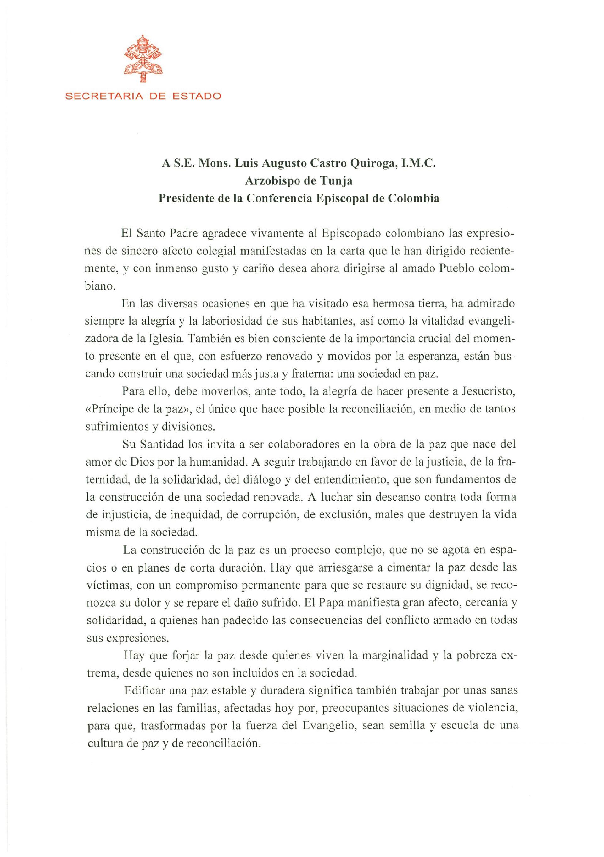 Centro de información Yo quiero Noticias Boletines Eventos Artículos Canonización Mensajes del Señor Cardenal Cartas pastorales Homilías Mensajes La voz del pastor Documentos del Vaticano NoticiasMensaje del Papa Francisco a Colombia3 de Abril de 2015 Like 0 Dislike 0 Noticias relacionadas Archivo del Plan de Predicación - 2024-2025 Tiempo para nutrir, cuidar y testimoniar la fe La Arquidiócesis de Bogotá celebró la ordenación de nuevos sacerdotes y diáconos