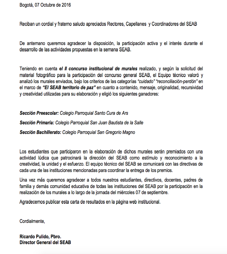 Centro de información Yo quiero Noticias Boletines Eventos Artículos Canonización Mensajes del Señor Cardenal Cartas pastorales Homilías Mensajes La voz del pastor Documentos del Vaticano NoticiasMurales ganadores II concurso13 de Octubre de 2016 Like 0 Dislike 0 Noticias relacionadas Mensaje de Mons. Edwin Vanegas Cuervo,obispo auxiliar de Bogotá La Santa Misa en Semana Santa La Arquidiócesis de Bogotá celebra el nombramiento de Monseñor Paolo Rudelli en la Santa Sede