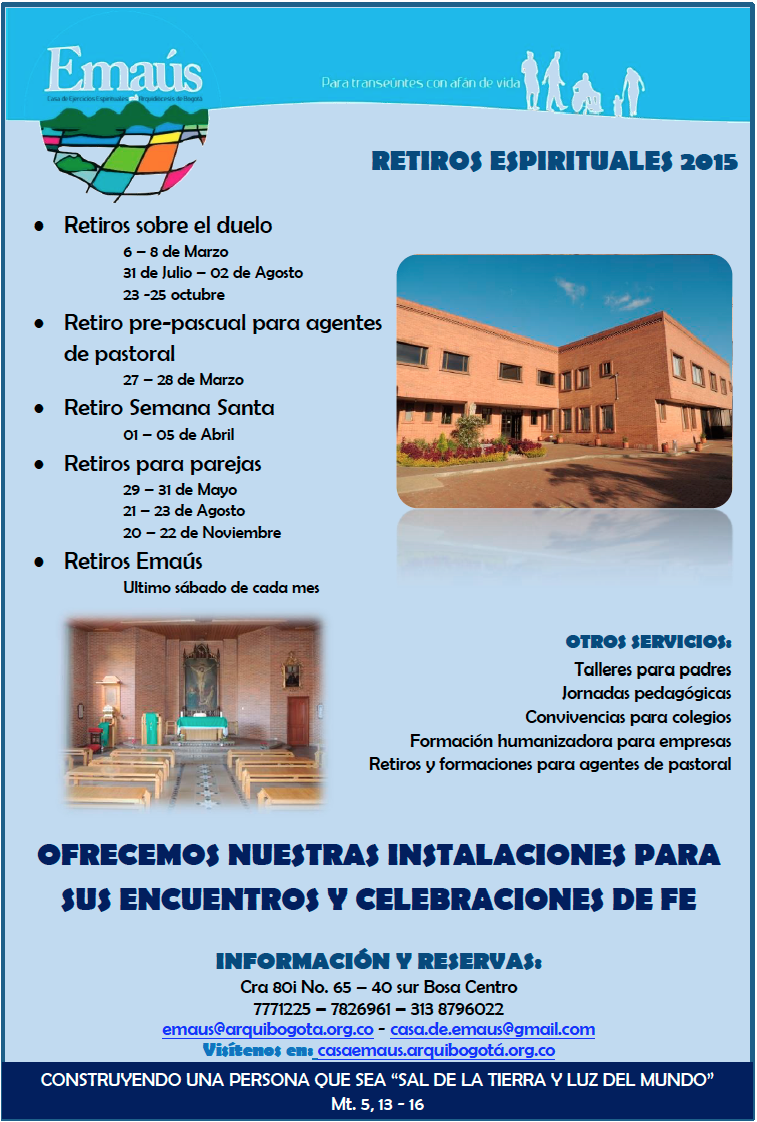 Centro de información Yo quiero Noticias Boletines Eventos Artículos Canonización Mensajes del Señor Cardenal Cartas pastorales Homilías Mensajes La voz del pastor Documentos del Vaticano NoticiasRetiros espirituales 201522 de Febrero de 2015 Like 0 Dislike 0 Noticias relacionadas Archivo del Plan de Predicación - 2024-2025 Tiempo para nutrir, cuidar y testimoniar la fe La Arquidiócesis de Bogotá celebró la ordenación de nuevos sacerdotes y diáconos