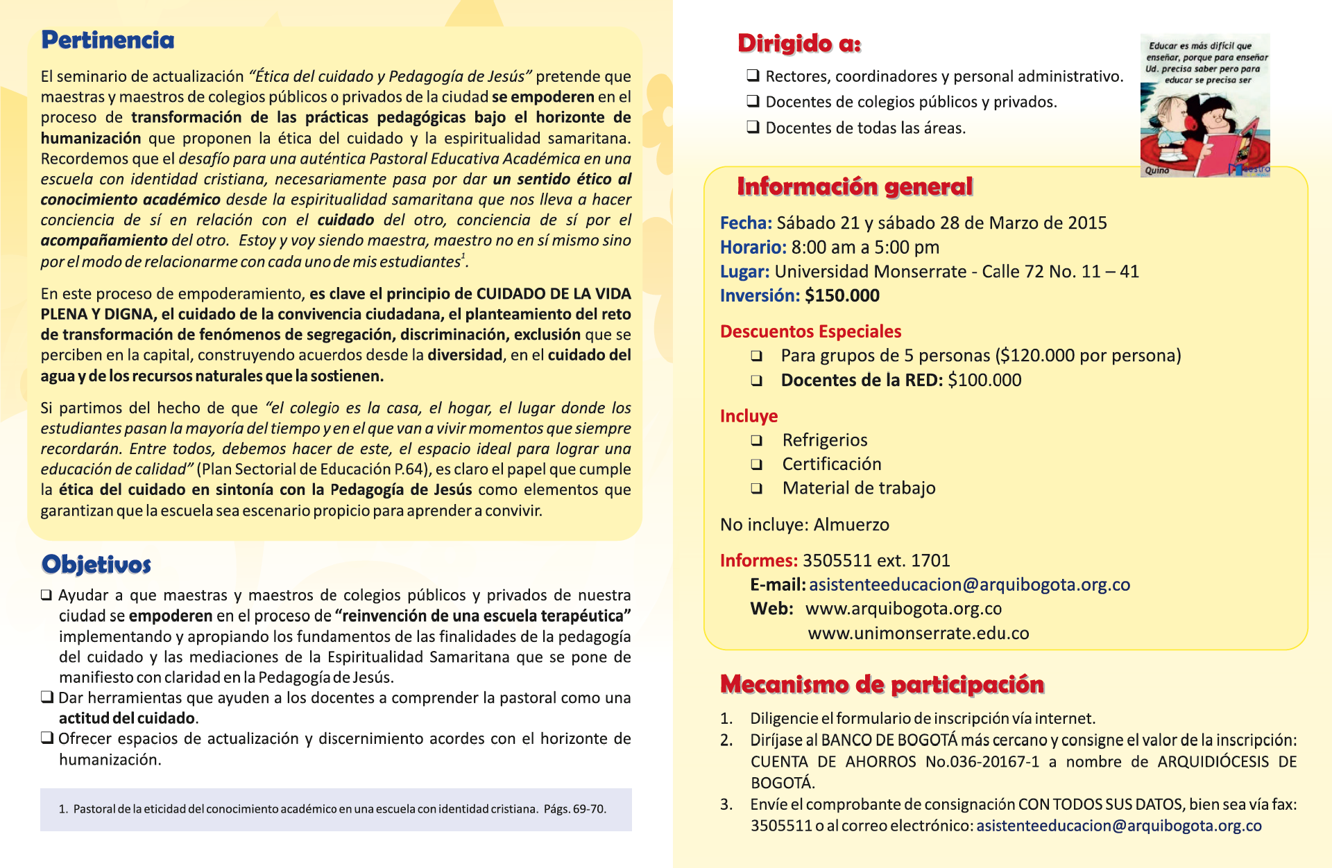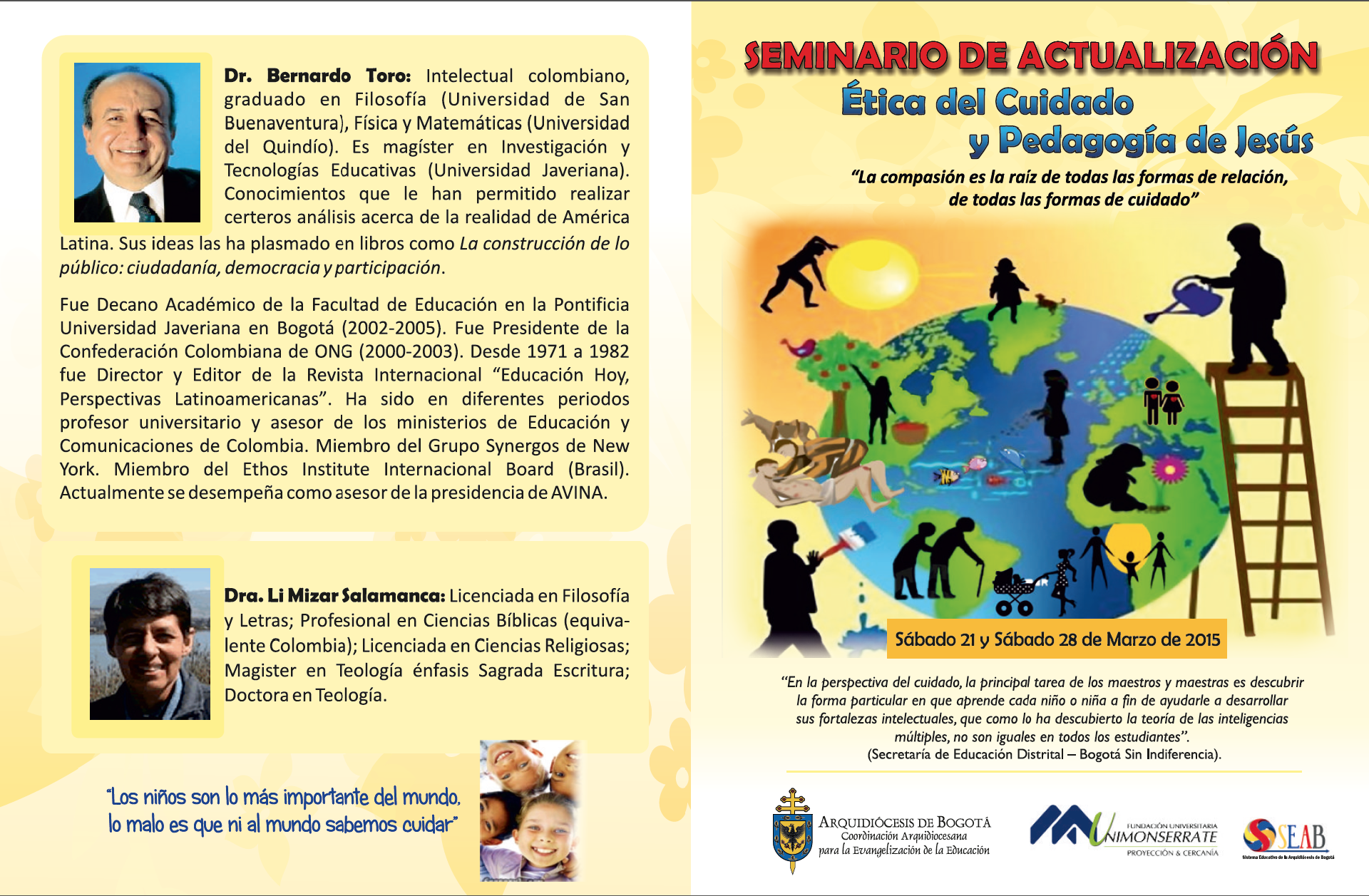 Para este proceso de actualización contamos con la iluminación del Dr. Bernardo Toro profesional de larga experiencia en su compromiso con una sociedad más ética y justa desde los distintos ámbitos sociales e institucionales en que él aporta luces fuertemente significativas.  La Dra. Li Mizar Salamanca quien desde su formación teológica y de lectura de realidad nos fundamenta su propuesta desde el Evangelio de Jesús para la ética del cuidado.  Todo ello en consonancia con el nuevo paradigma de evangelización del Plan E de nuestra Arquidiócesis de Bogotá.