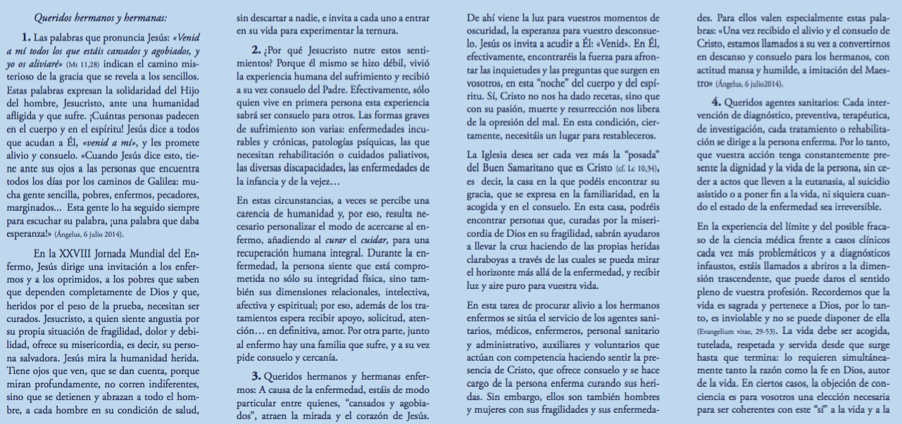 Centro de información Yo quiero Noticias Boletines Eventos Artículos Canonización Mensajes del Señor Cardenal Cartas pastorales Homilías Mensajes La voz del pastor Documentos del Vaticano NoticiasXXVIII Jornada mundial del enfermo, mensaje del Santo Padre Francisco11 de Febrero de 2020 Like 0 Dislike 0 Noticias relacionadas Archivo del Plan de Predicación - 2024-2025 Tiempo para nutrir, cuidar y testimoniar la fe La Arquidiócesis de Bogotá celebró la ordenación de nuevos sacerdotes y diáconos